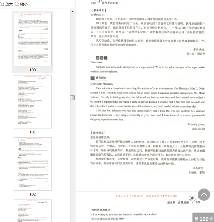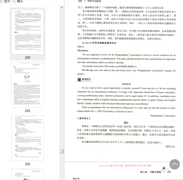 通过前五章的具体讲解及论述,相信同学们会对考研英语写作有一个准确的把握。在第六章,笔者汇总了常见的考研英语应用文写作及短文写并给出了相应的参考范文,希望可以满足同学们的备考之需