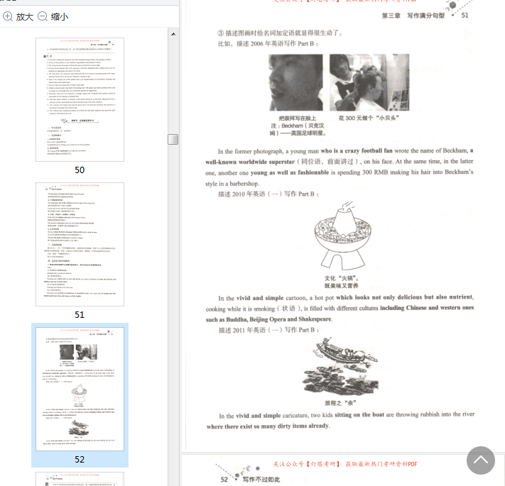 第七章首先按话题分析了考生的作文,供同学们反观自己,力求避免出现相似的错误。在第二节,笔者在帮助同学们一一列举了历年考研英语写作真题的同时还给出了参考范文,同学们可以据此“小试牛刀看一看自己的收获如何在本书的最后,另附写作经典句型100句,以供各位同学学习。笔者的良苦用心,各位同学,你们体会到了吗?