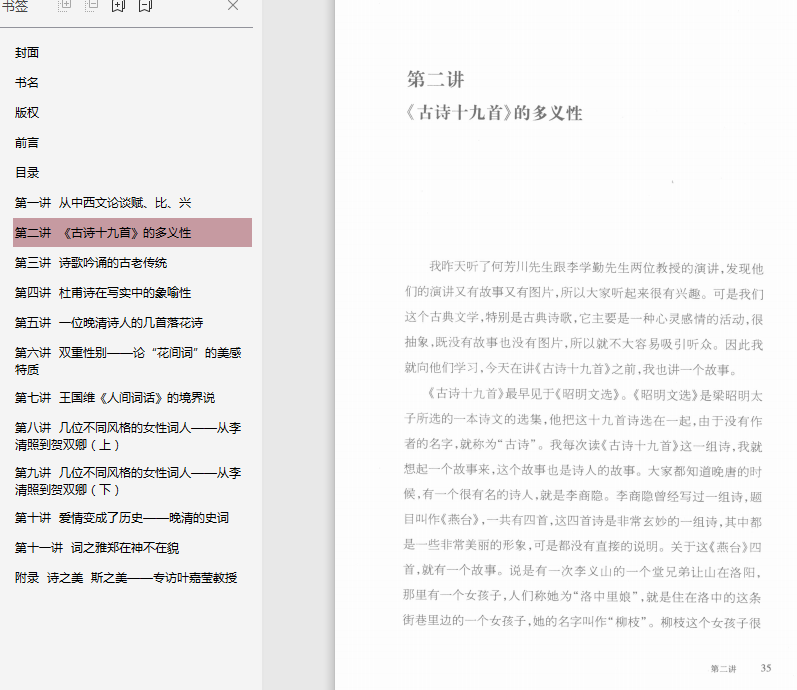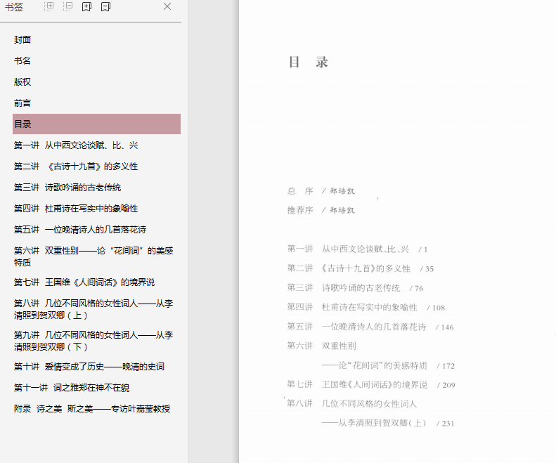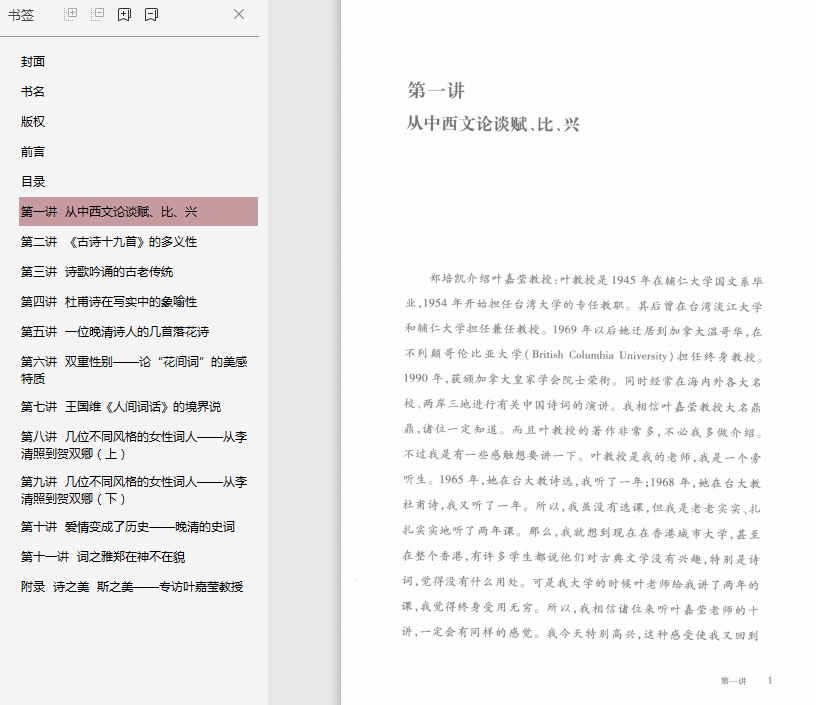 若细读全书,不仅为上述种种而钦佩叶先生的学养深厚,更要紧的是慨叹叶先生讲诗读词时的竭尽心力。今日是无诗情的时代。唐诗宋词早已让位于流行歌曲,连带着诗人亦无昔日的光环,而多是病人的别称。但叶先生却毫不为俗见俗世所囿,因她晓得,人在什么时候都需要诗的浸润与涵养。我撰作此文非彰表叶先生的功力精深,自己亦无此能,但由叶先生的讲解,使得我们再一次唤起对中国古典诗词的兴味与感动。书中讲解诗词非如时下人但求释解字词,辨识格律,仅以口舌增损口角波俏为高,而于诗情文心如当面隔山川。叶先生带领学生经由字词的切实掌握,进而从容迈步进诗词的后花园,体味涵泳其中的人情丰美与生命本有的意境。