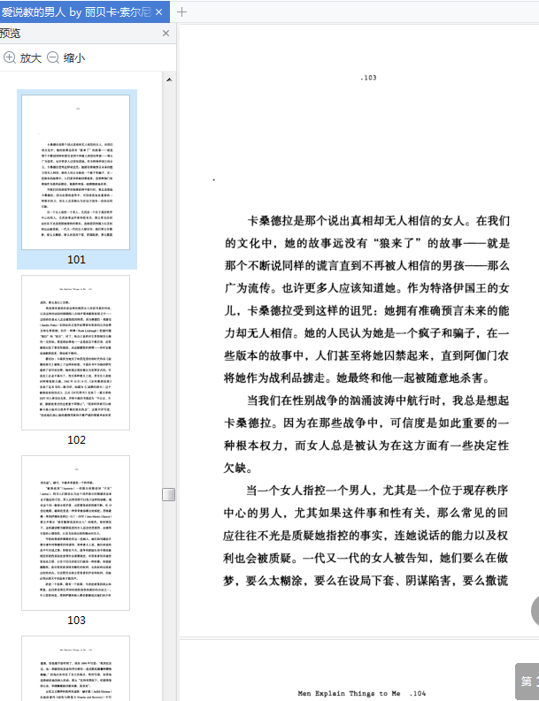 索尔尼特勾勒了女性悲剧的共同命运,女性就像神话中被诅咒的卡桑德拉,因为挑战男性权力,她的预言和见证无人相信。这本书呼唤社会打破卡桑德拉式的诅咒,让女性不再是处于永恒的隶属地位的客体,在社会制度和想象空间层面获得双重解放。