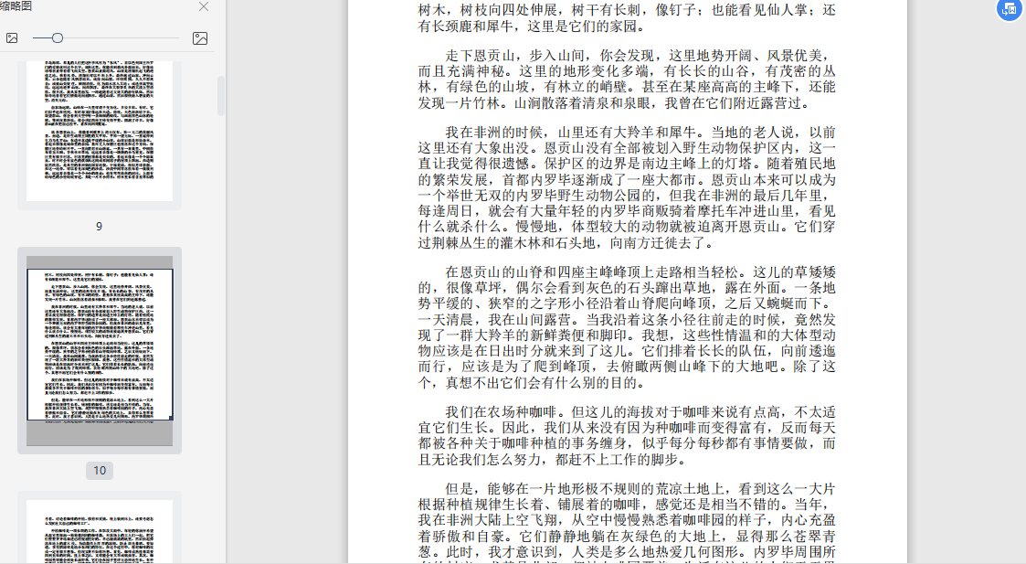 恩贡山头的景色美妙绝伦:南面是野生动物禁猎区,广袤的原野一直延伸到乞力马扎罗山脚;东面是花园一般秀美的丘陵地貌,在更远处化为一片森林;北侧是地势起伏的吉库尤人居留地,方方正正的玉米田、香蕉丛和绿草地交相连缀,一直延伸到百余英里外的肯亚山脚,宛如一幅马赛克。土著村落则像很多尖顶的鼹鼠丘聚在一起,不时升起几道青色的炊烟。但如果向西深入,就进入了一片干燥的非洲低地,像月球表面一般坑洼不平。褐色沙地散生着小丛荆棘,蜿蜒的河岸绘着墨绿色的痕迹,那是枝舒叶展、棘刺硬如长钉的金合欢。这里遍地生长着仙人掌,也是长颈鹿和犀牛的家园。