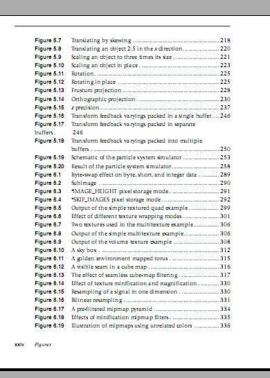 另外,《Open GL编程指南(原书第8版)》还深入探讨了许多高级技巧,包括纹理贴图、抗锯齿、雾和大气效果、NURBS、图像处理子集等。