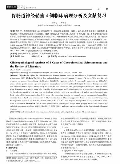 [6] 伍健,王景美,孟凡青,等.胃肠道神经鞘瘤16例临床病理特征[J].临床与实验病理学杂志,2011,27(3):307-310.